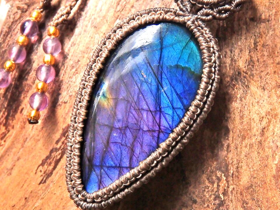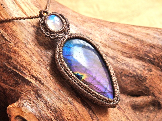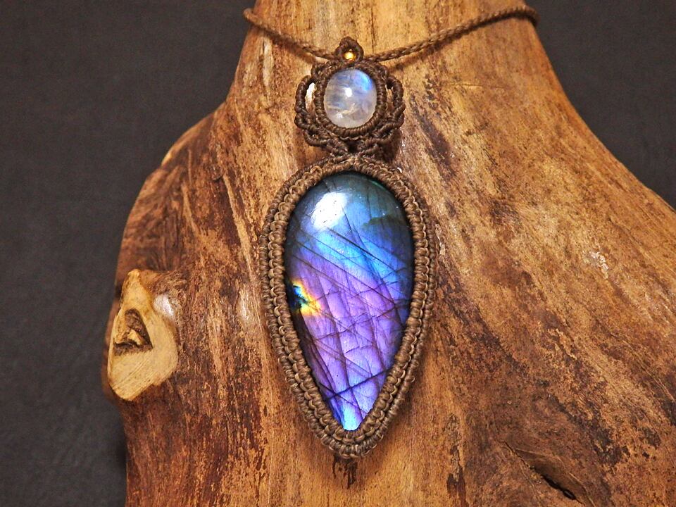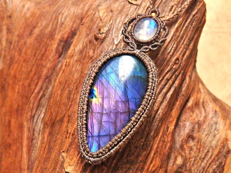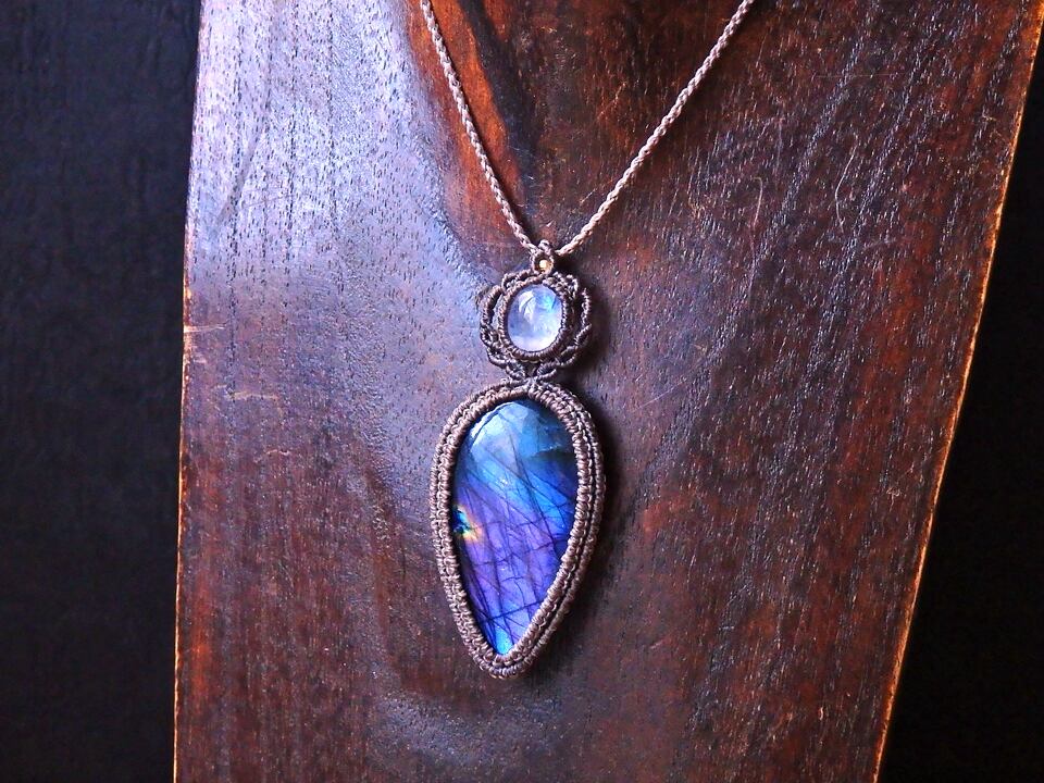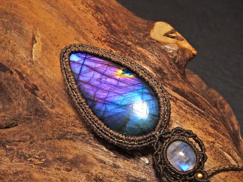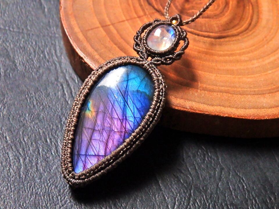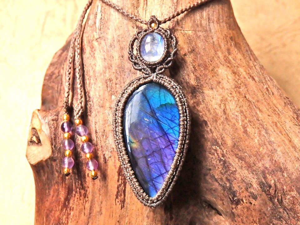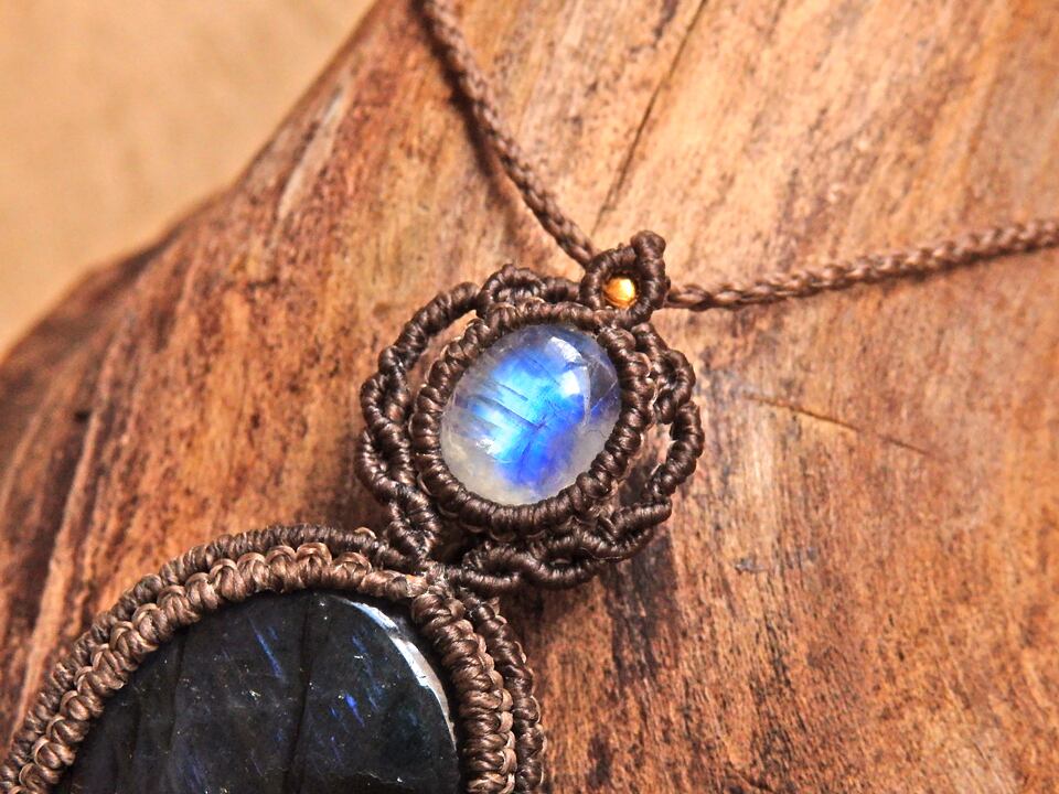 マルチカラーラブラドライト & ムーンストーン マクラメペンダント