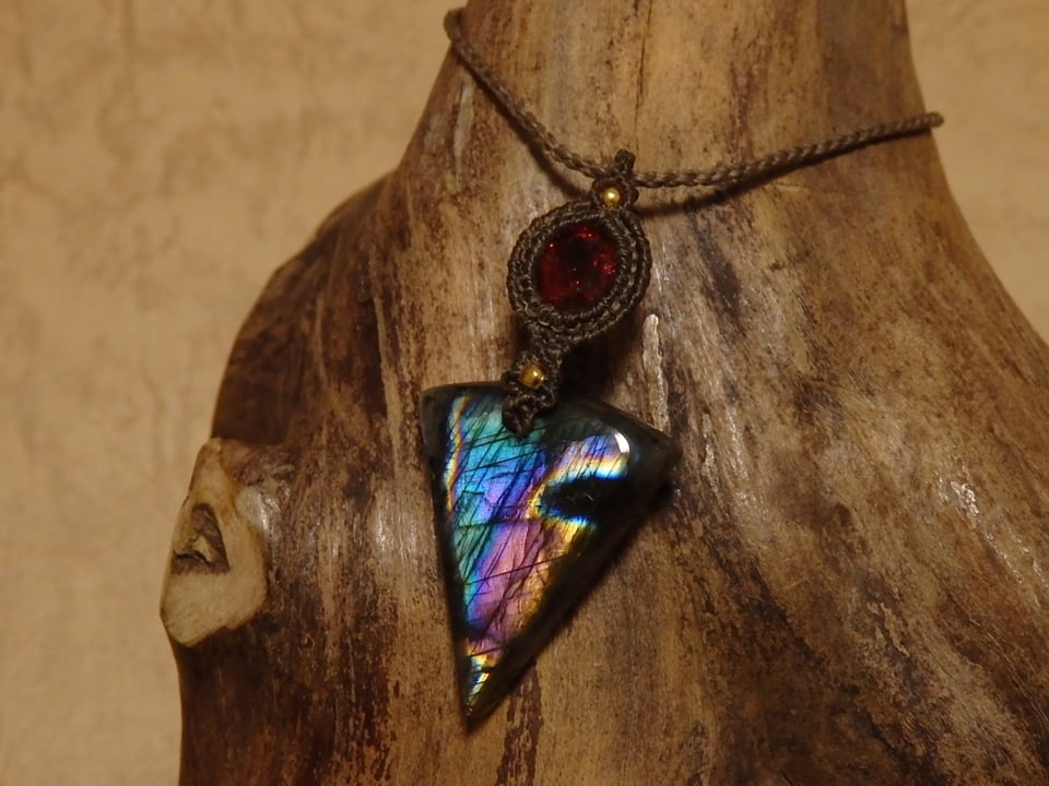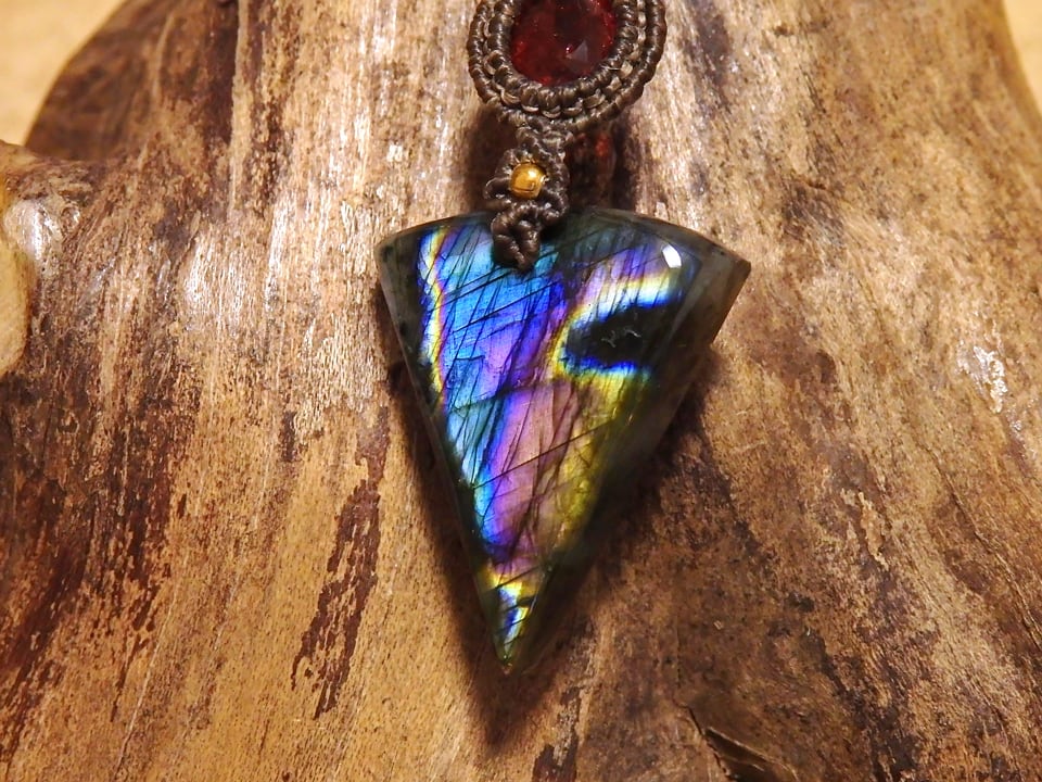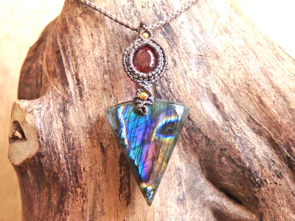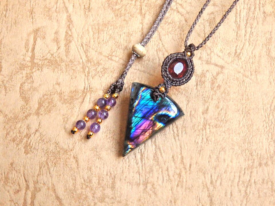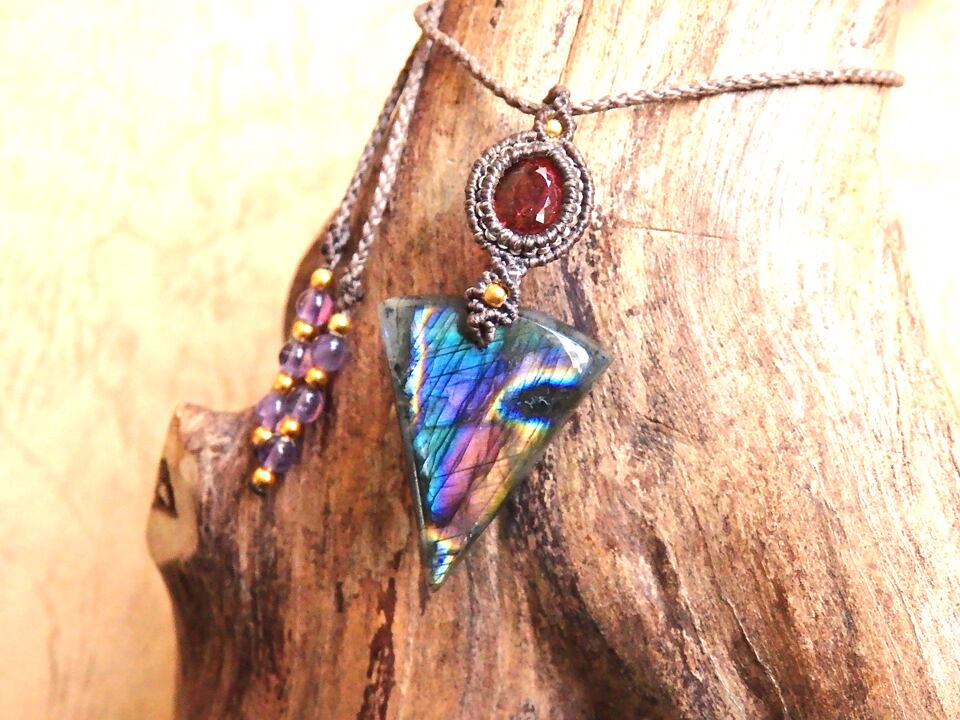 マルチカラーラブラドライト & ピンクトルマリン マクラメペンダント