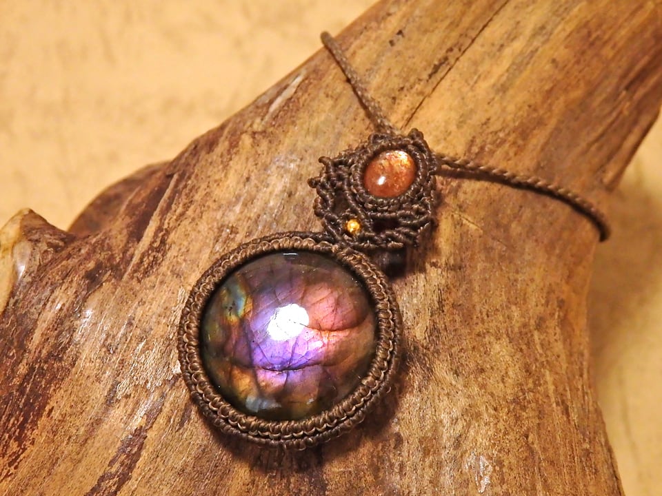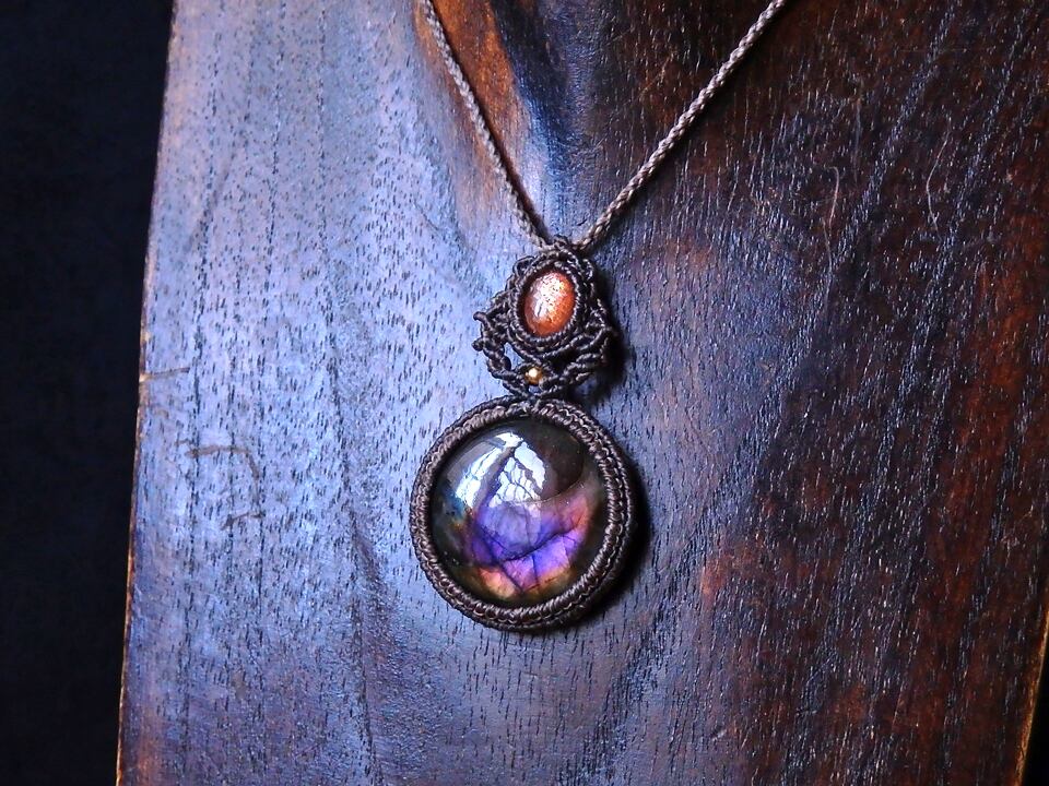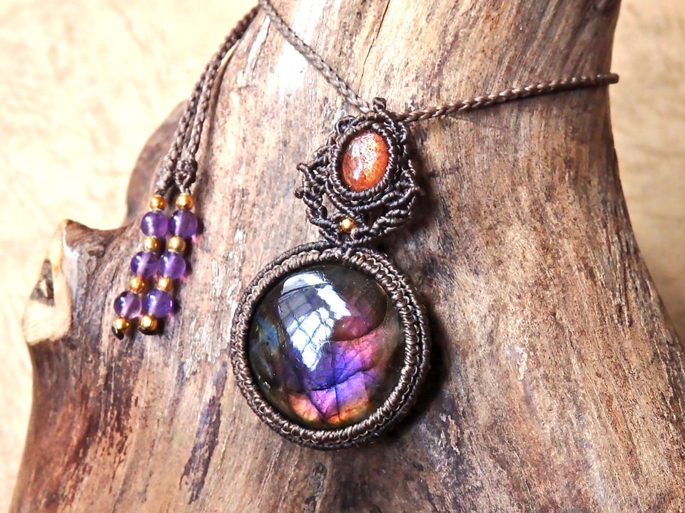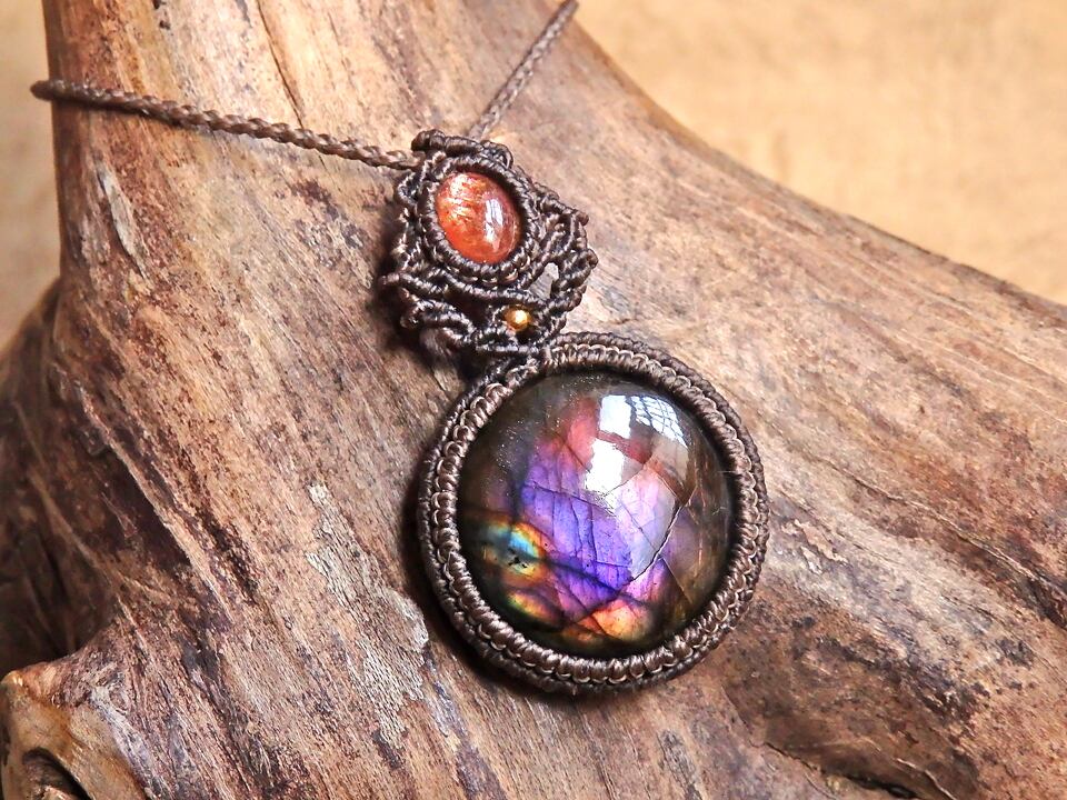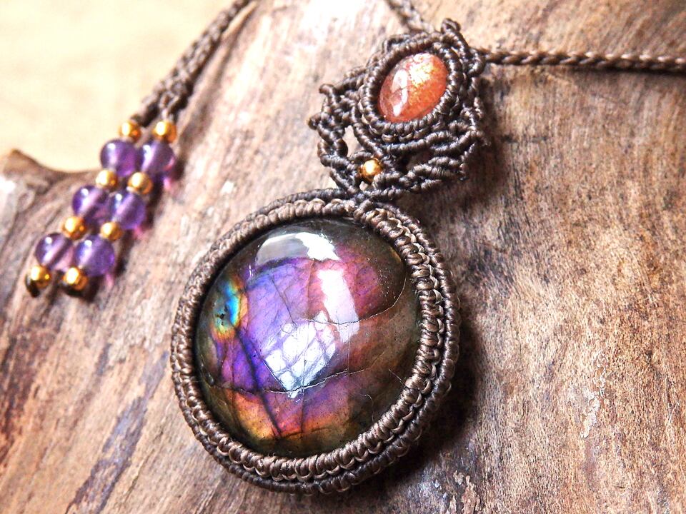 【ご予約済み】マルチカラーラブラドライト & サンストーン マクラメペンダント