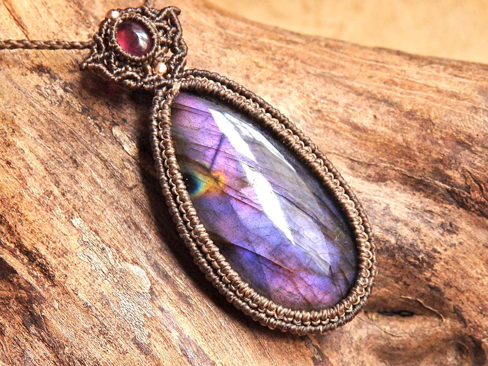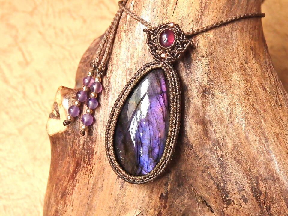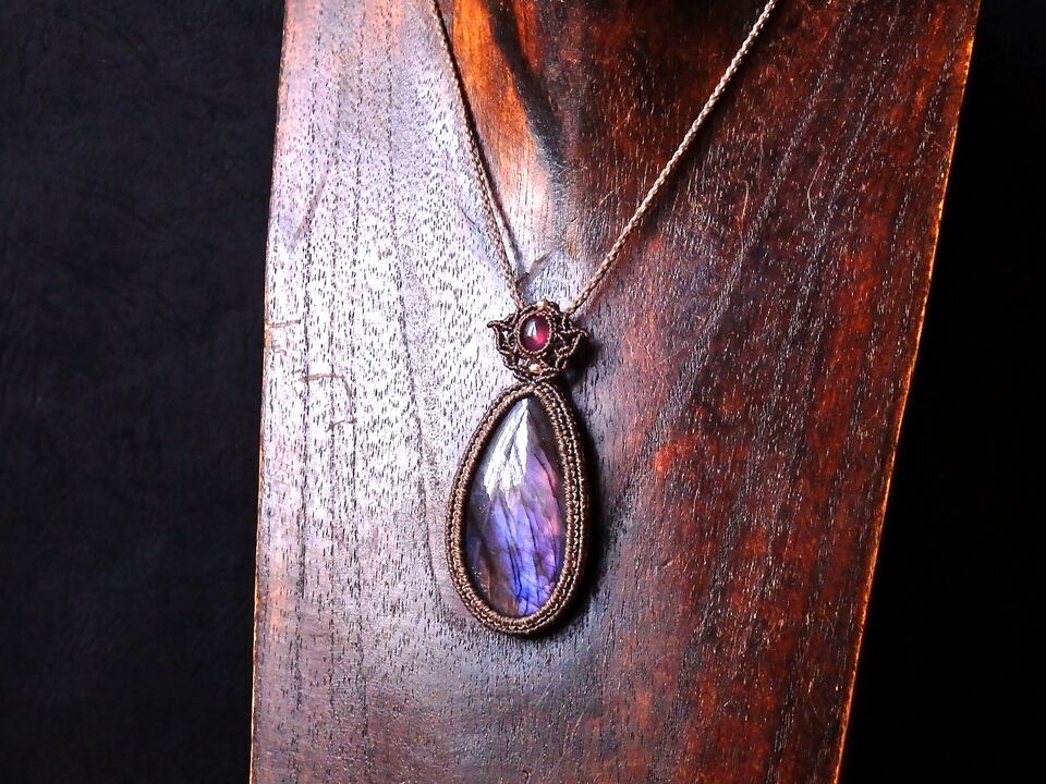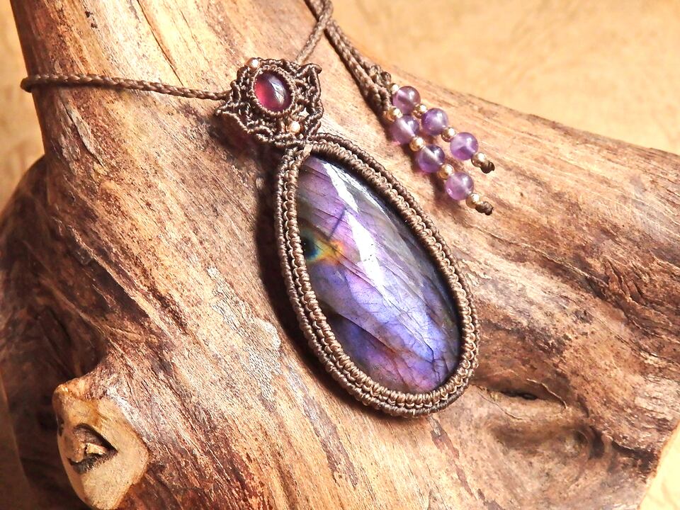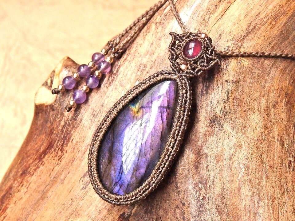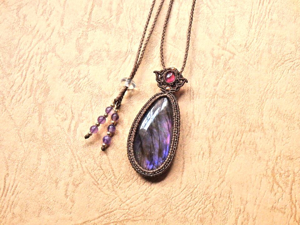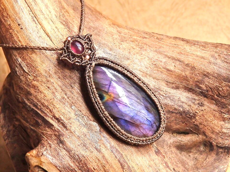 パープルラブラドライト & ルビー マクラメペンダント