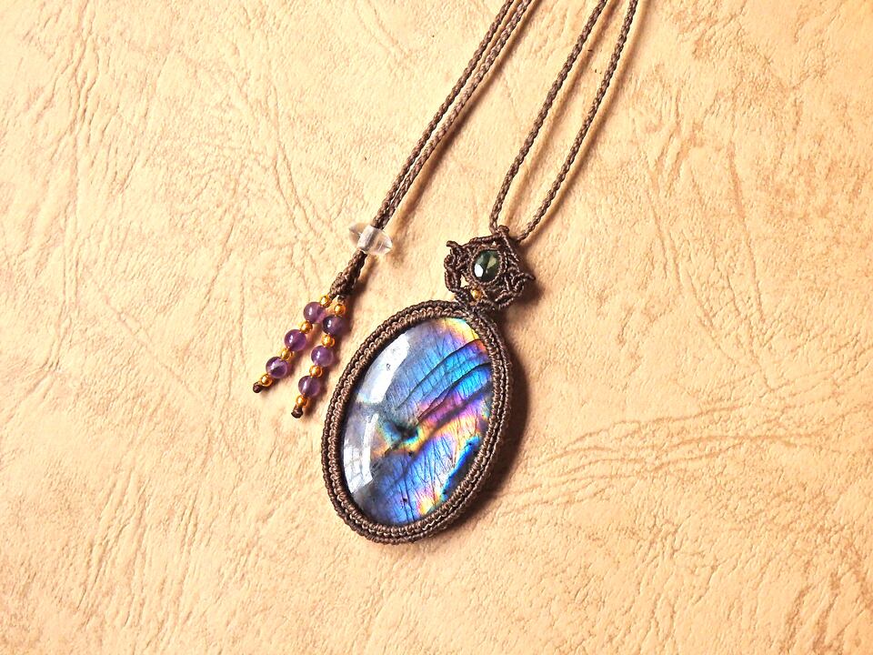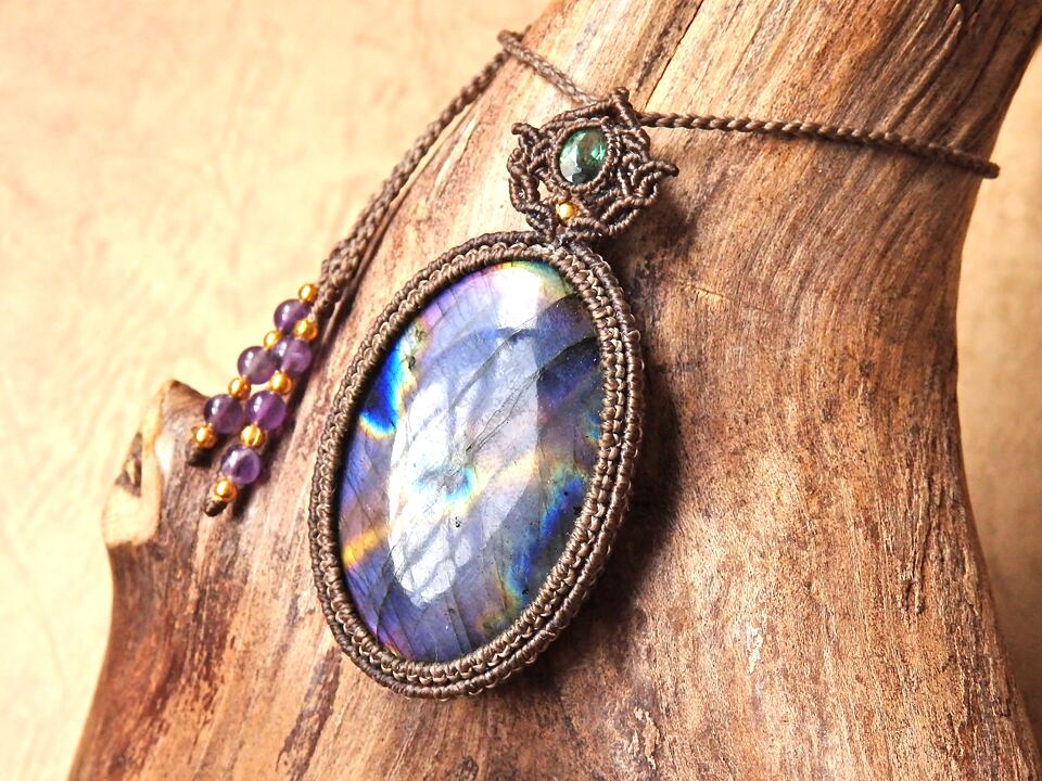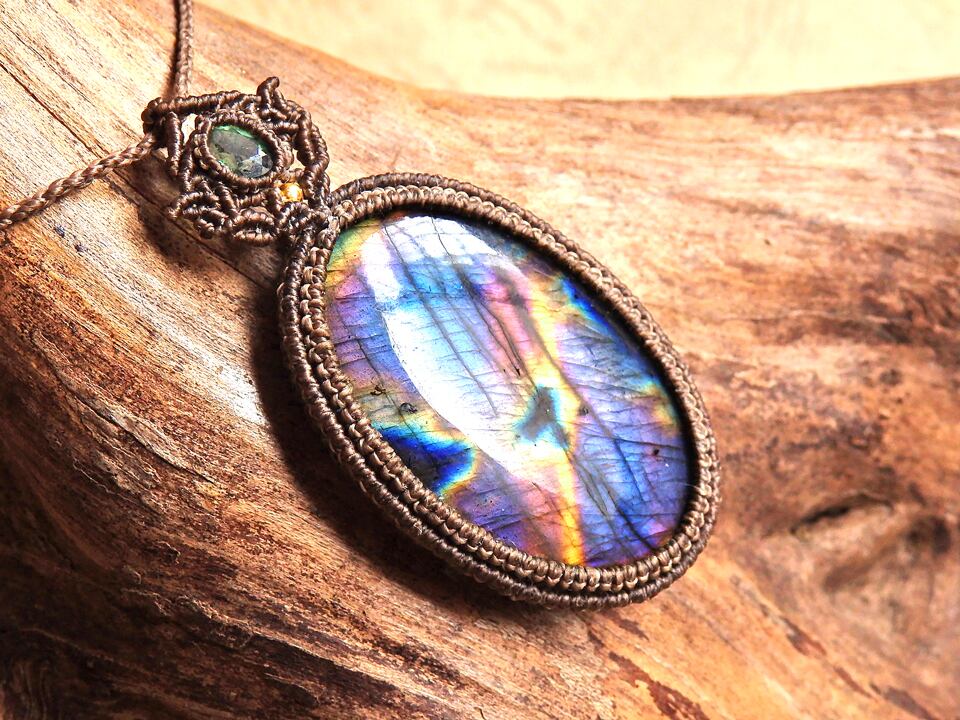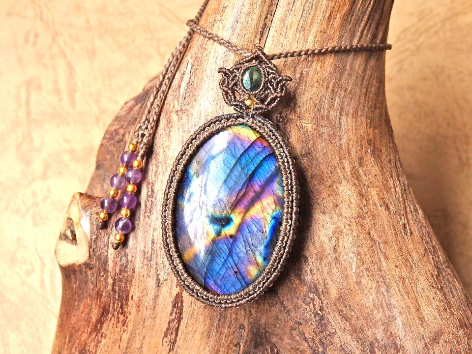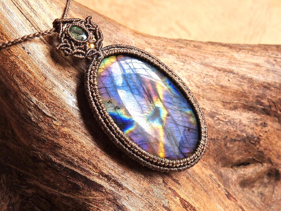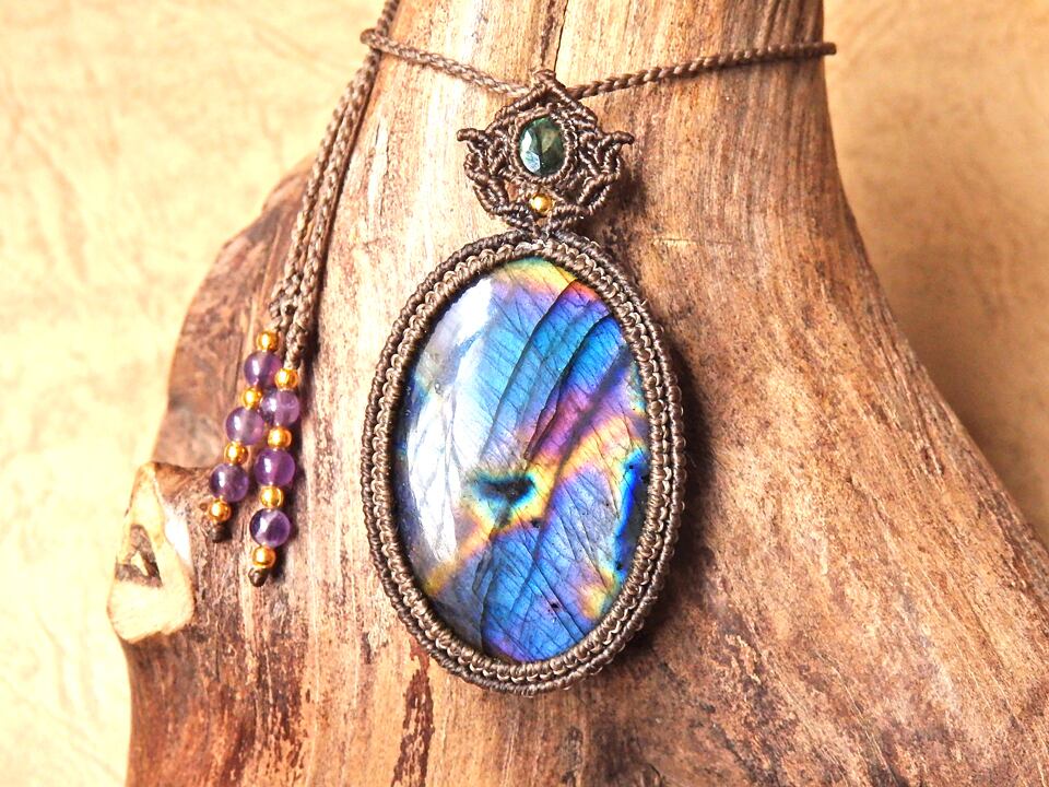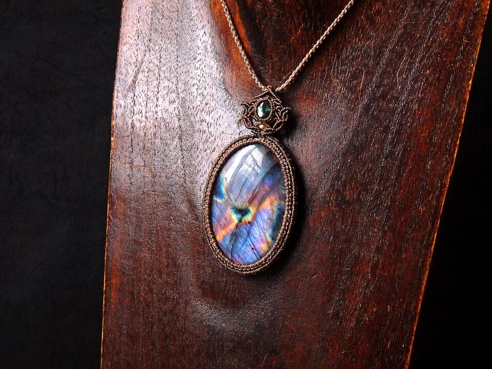 マルチカラーラブラドライト & クロムダイオプサイト マクラメペンダント
