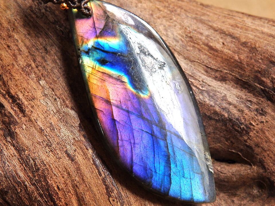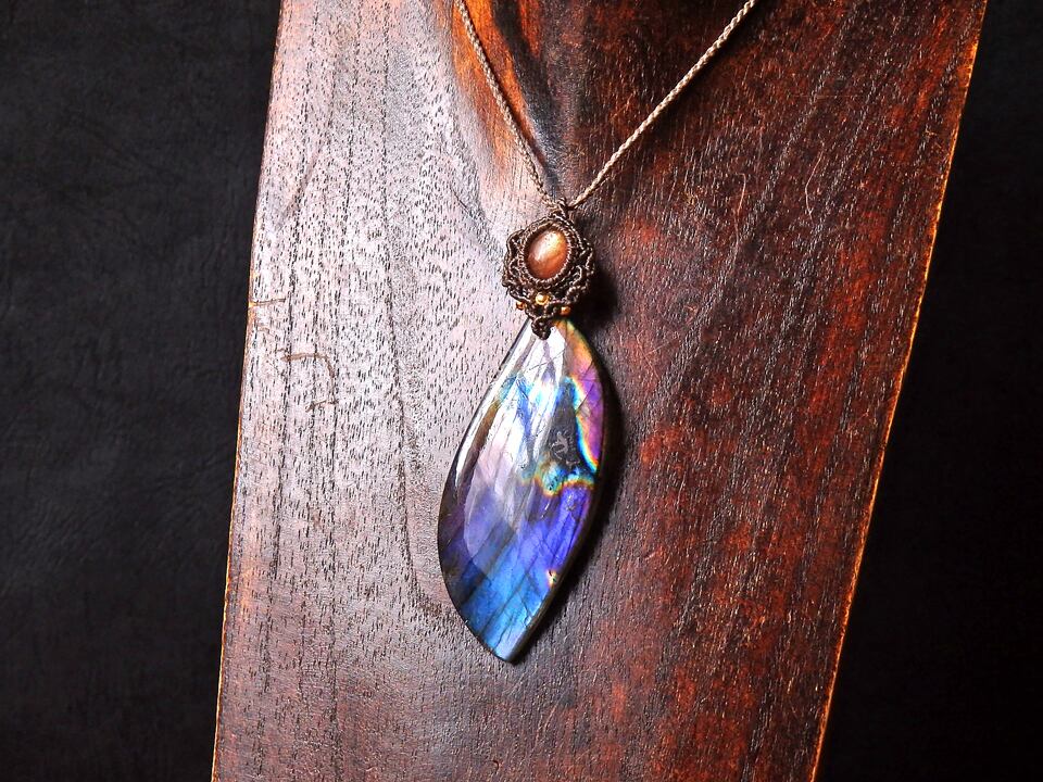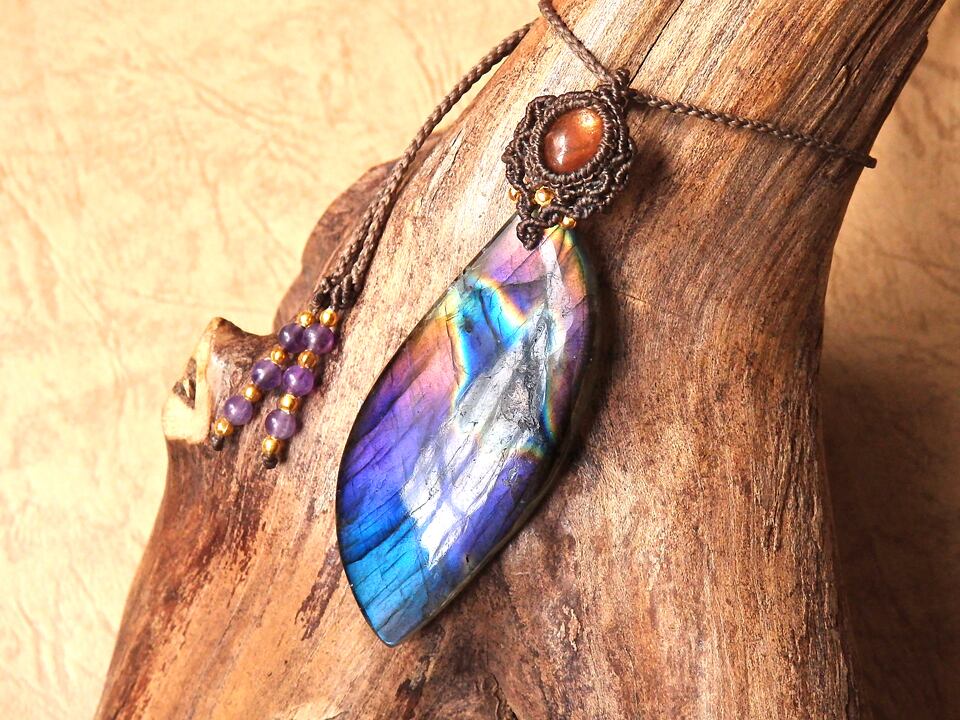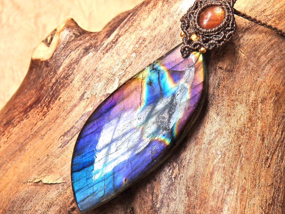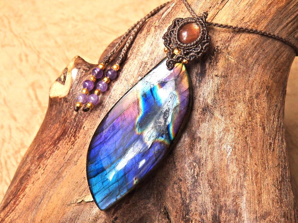 マルチカラーラブラドライト & サンストーン マクラメペンダント